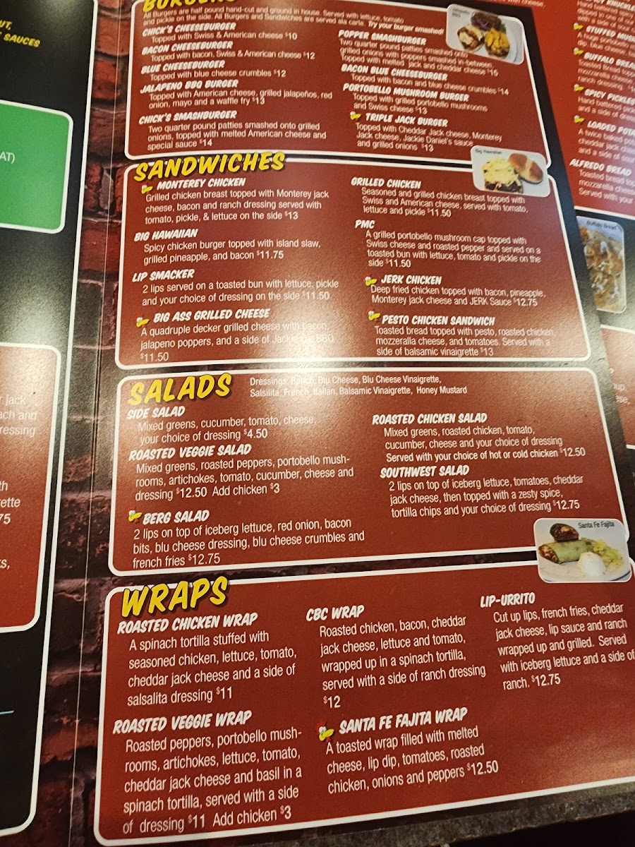 2 Lips on top of iceberg lettuce, tomatoes, cheddar jack cheese, then topped with a zesty spice, tortilla chips and your choice of dressing